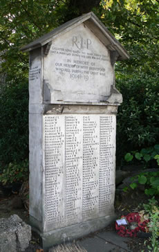 The war memorial stands in the churchyard of St Lawrence's Church, on the south side of the High Street near the road side. It is inscribed 'In memory of our heroes of West Brentford who fell during the Great War 1914-1919'. The memorial lists 172 names in four columns and another 5 names on the left side of the memorial.