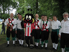 | Buzz Bee poses with the Morris Men. He didn't quite dare have a go!