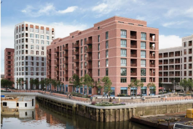 The four blocks which will also include commercial space, car and cycle parking and landscaping with renewed access to the Thames Path at the front of the building.