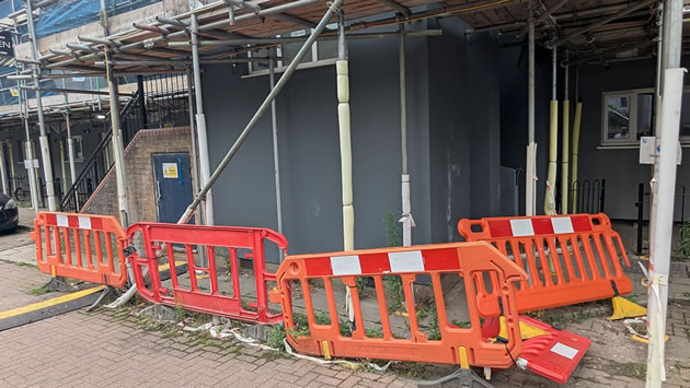 The scaffolding is still up, which makes the place dark and insecure (easy to climb, especially as there is even a ladder in place, albeit ineffectively locked). I first became really aware of the problems here when it came into my ward in May 2022. The works started soon after but they have not progressed at all for 4 months+ Many of the flats' doors have polythene sheets on them and a notice that says wet paint (if so it is very weird paint).
