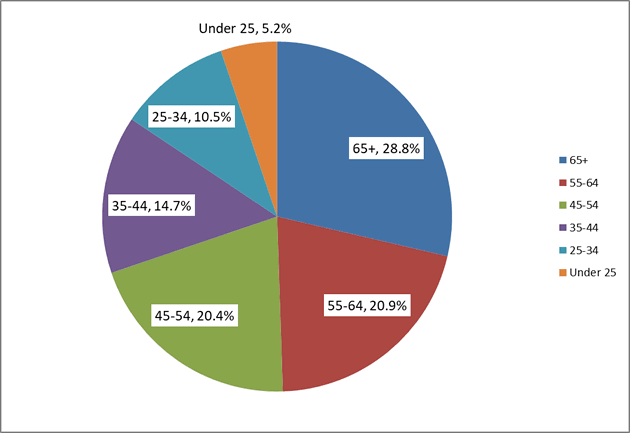 Our subscriber base is older than the national average with over 35% aged 35-54 and 56% aged 35-64. Only 5.2% are aged under 25.