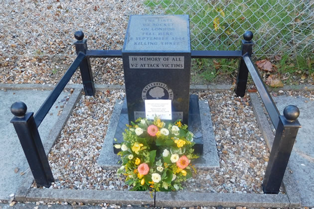 The V2 rocket landed in the centre of Staveley Road, towards the junction with Burlington Lane on 8 September, 1944. The memorial is close to this spot, where today there is a small electricity sub-station.