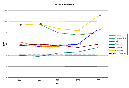 Figures released by Hounslow Council earlier in the year showed Chiswick High Road having poorer air quality than the Cromwell Road after a dramatic deterioration during 2003 as measured by the concentration of nitrogen dioxide (NO2). This rose by an astonishing 43%.