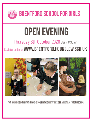 Brentford School for Girls is a friendly, caring and ambitious community school and open evening is an opportunity for you and your daughter to discover what ‘Brentford School for Girls' has to offer. Please register your details for our open events at www.brentford.hounslow.sch.uk and find out more about our school from our ‘ Discover More' digital information packs created to give you an insight into the fantastic opportunities we can offer you and your daughter.