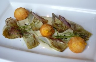 Artichoke "alla giudea" with cream of leeks and provolone fonduta