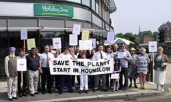 Members of the local community staged a demonstration outside Brentford’s Holiday Inn where Ann Keen was hosting the screening. Campaigners waved placards and handed out leaflets to draw attention to the fact that the government, members of which attended the event, had presided over an increase of nearly 40,000 flights per year at Heathrow since the general election 1997.