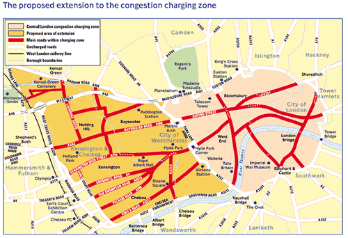 The proposal will extend the existing charging zone to include the area to the west of the current central London charging zone, broadly bounded by Harrow Road, Scrubs Lane, West Cross Route, Earls Court Road and Chelsea Embankment, encompassing most of the boroughs of Westminster, and Kensington and Chelsea. The area suffers congestion throughout the day, comparable with that experienced in the central area.