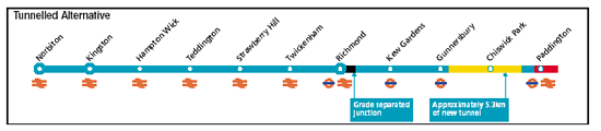 If the tunnelled route is chosen all District line Richmond services would be replaced. Passengers could change to the District line at Chiswick Park. There appears to be no contigency for the reduction in service that would take place at stations east of Gunnersbury such as Turnham Green. Silverlink North London Line services would remain but there could be alterations to some South West Trains services