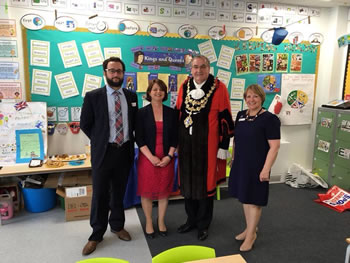Rabbi Jason Rosner, Kate Baum head teacher, Mayor Cllr Richard Field & Judy Thwaites MJPS Associate Governor