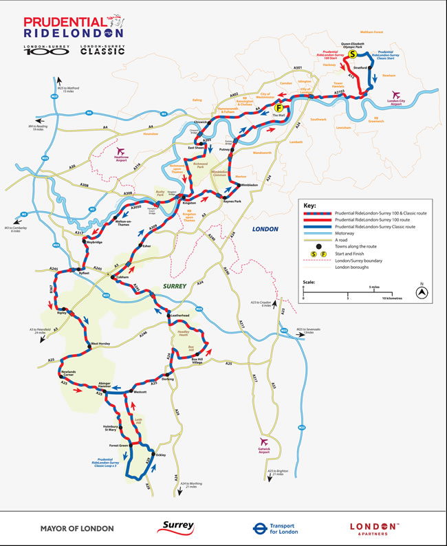 The Prudential RideLondon-Surrey Classic and Prudential RideLondon-Surrey 100 take in some of the routes of the Olympic road races last Summer such as Richmond Park and Box Hill, although there are key differences - including the route through Wimbledon and the fact that the way out of and back into the centre of London is a loop, rather than along the same roads.