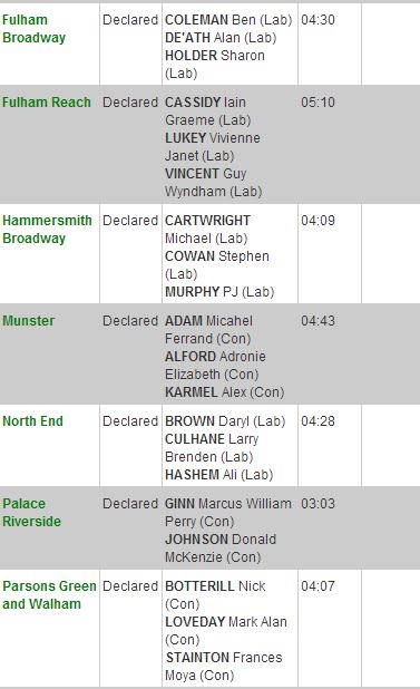 The result was announced just at 5am after Labour gained all three seats in the Fulham Reach ward. It is possible that controversial housing developments in this area swung voters away from the ruling Conservatives.