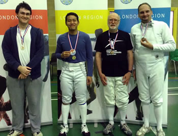 Pictured above: Intermediate Sabre L to R Silver Pawel Zakiewicz, Wimbledon Gold, Daniel Lwanzambi City Fencing