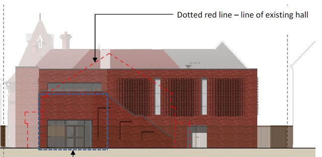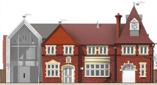 The design proposed (below) still increases the size of the front elevation, with glazing features that will allow the original building to be seen through the glass.