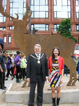Sculptor Isabelle Southwood (pictured with Mayor David Williams), who comes from Wimbledon, said she took her inspiration from Stag Lodge in Wimbledon Park. The stag stands on the station forecourt as if it had wandered down the hill, linking together Wimbledon town centre's heritage and its relationship with the Common.