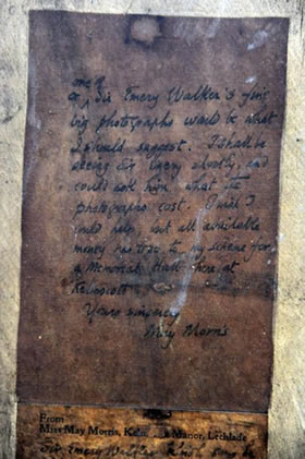 The note sent to William Morris House nearly 80 years ago was found pasted to the back of the picture of Morris. It advised William Morris House how to obtain from Emery Walker this original picture of Morris. May Morris was a celebrated designer in her own right and the note is written on headed note paper sent from Morris’s house Kelmscott Manor in Gloucestershire.