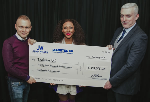 Show producer Jamie Wilson, (left) star of Sister Act: The Musical and a supporter of Diabetes UK with Alexandra Burke (centre) recently presented Diabetes UK representative Stephen Ryan (right) with the cheque, largely raised by audiences at New Wimbledon Theatre.